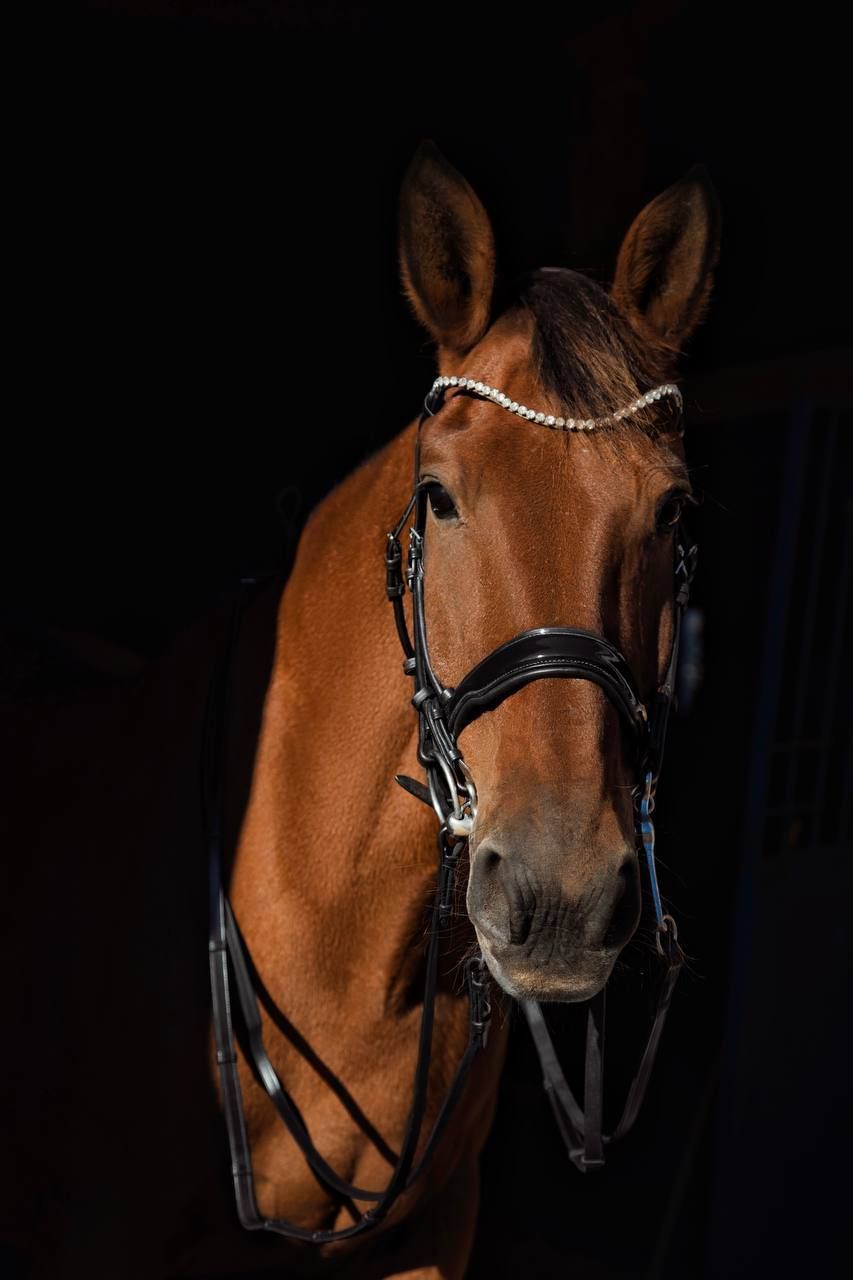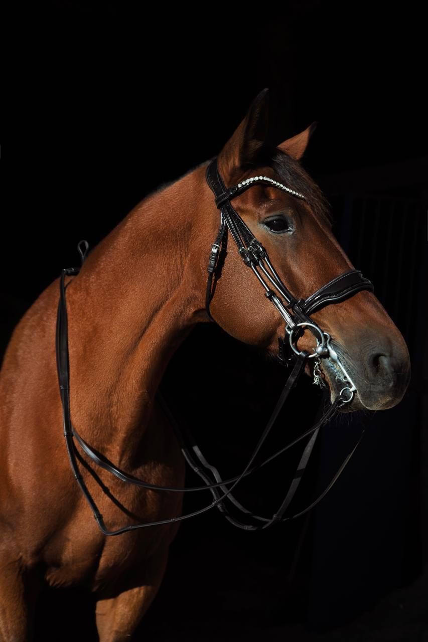 Мундштучное оголовье◾️ Благодаря анатомической форме и мягкой подложке затылочного ремня, оголовье необычайно удобно для лошади◾️ Самозатягивающийся лакированный капсюль с мягкой подложкой ◾️ Налобный на липучке, обрамленный стразами ◾️ Фурнитура из нержавеющей стали◾️ 2 кожаных повода в комплекте