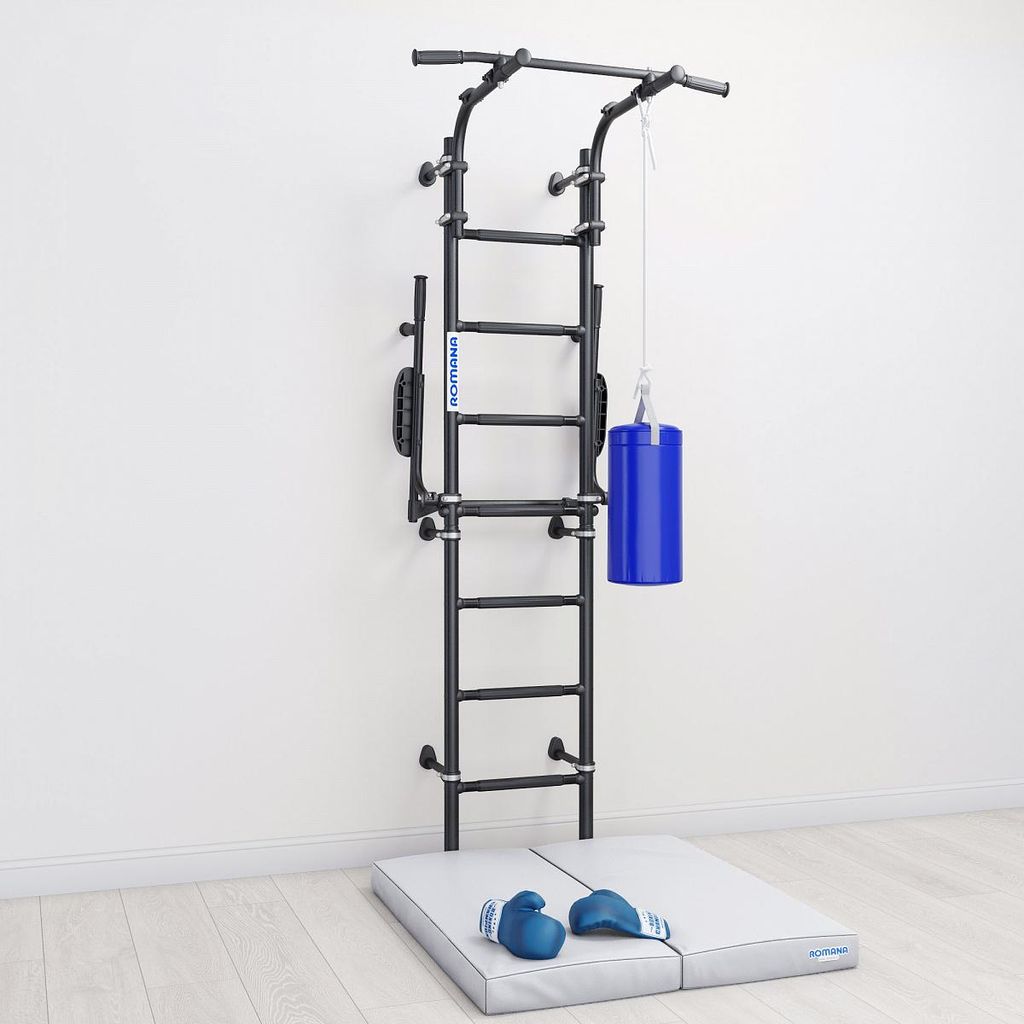 ROMANA S10 - домашний спортивный комплекс для всей семьи, на нем могут заниматься и дети, и взрослые. Он достаточно компактен и не занимает много места: ширина ступеней составляет 410 мм, это самый оптимальный размер для занятий на брусьях, которые идут в комплекте. Брусья откидные, и после занятий их можно перевести в вертикальное положение. Турник можно передвигать по высоте, и закрепить как удобно пользователю с помощью надежных современных хомутов. Спортивный комплекс фиксируется к стене, фиксаторы можно передвигать по вертикали, чтобы избежать попадания в проводку или полости.