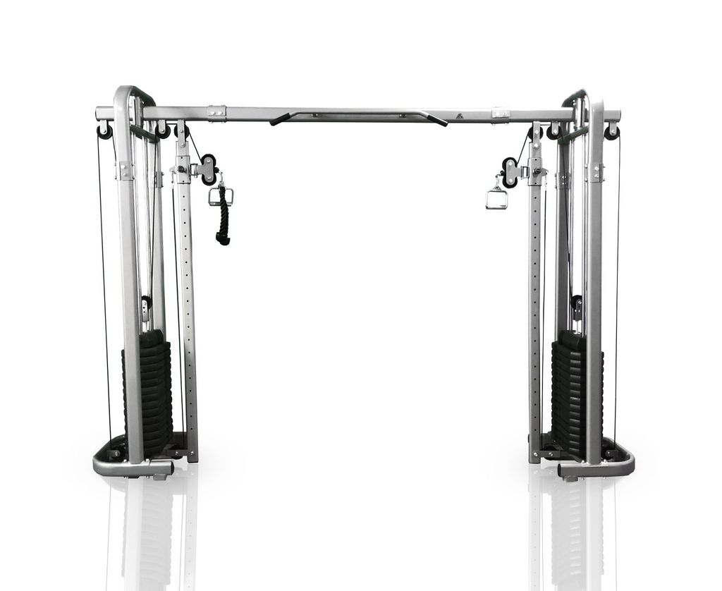 • Кроссовер оснащён двумя тягами — металлическими ручками с нескользящим хватом. Ручки регулируются по высоте в 21 положении: можно выполнять упражнения на разные группы мышц и варьировать угол тяги.