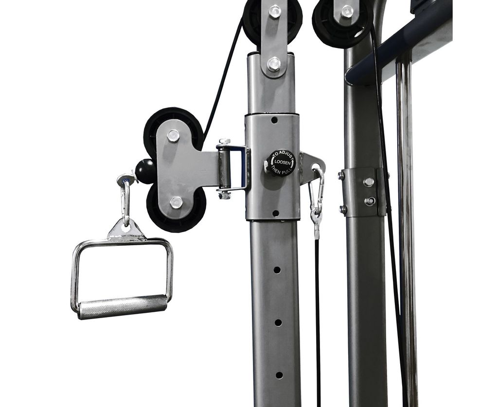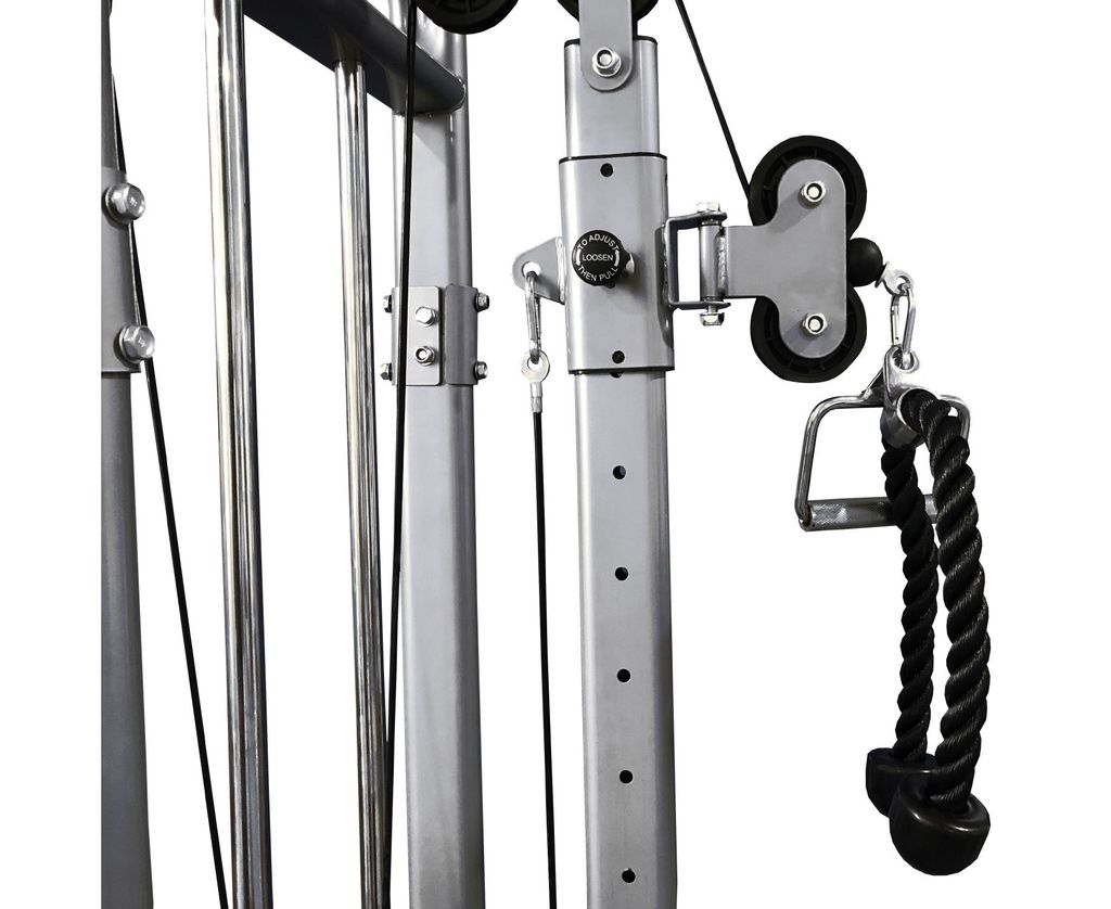 • В комплектацию входит канат для упражнений на трицепс и бицепс (сгибания, разгибания рук), мышцы плеч и кора (упражнение «священник»). Канат крепится к регулируемой по высоте каретке.