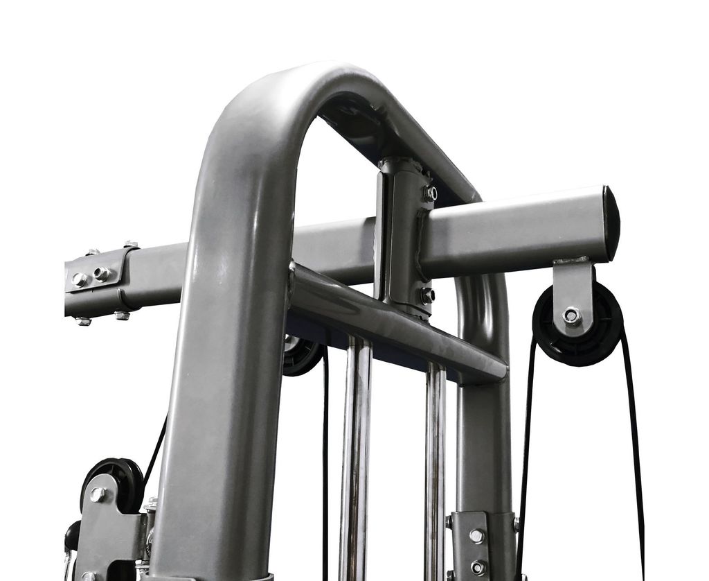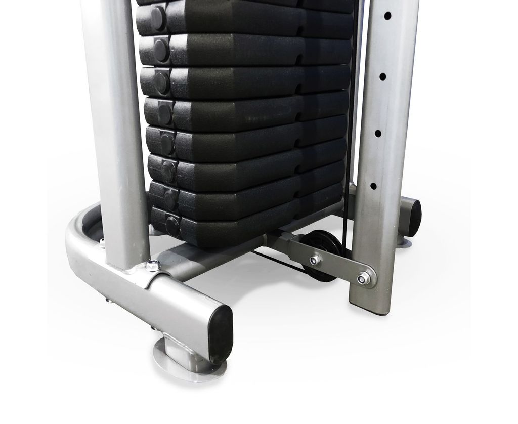 Силовые стеки весом по 75 кг входят в комплектацию. Вес пластин — 4 и 5 килограмм. Общая нагрузка регулируется при помощи фиксатора одним движением руки. Плавность хода стеков гарантируют ролики на подшипниках. Основа всей конструкции — рама из трубы размерами 40 х 80 х 1,5 мм.