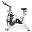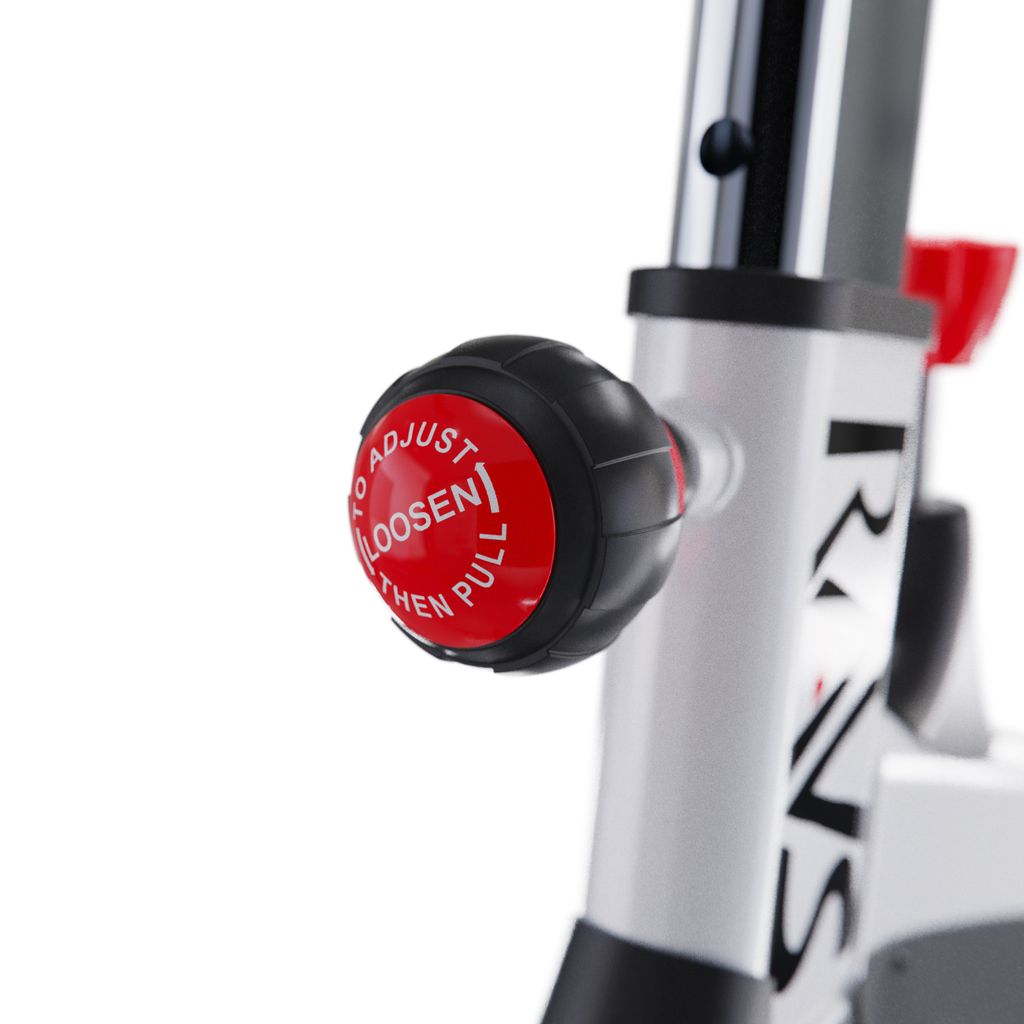 Спин-байк RAVS белого цвета имеет прочную стальную раму, что повышает его устойчивость и обеспечивает быструю езду. Он также оснащен большим алюминиевым маховиком с инерционным весом 19 кг, который обеспечивает дополнительный импульс и реалистичные ощущения от езды с препятствиями. Максимальный вес пользователя до 150 кг.