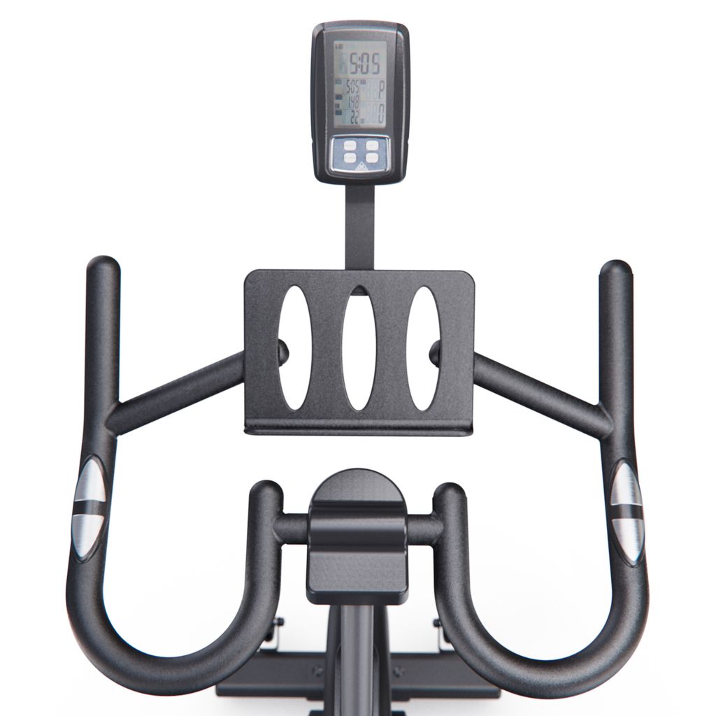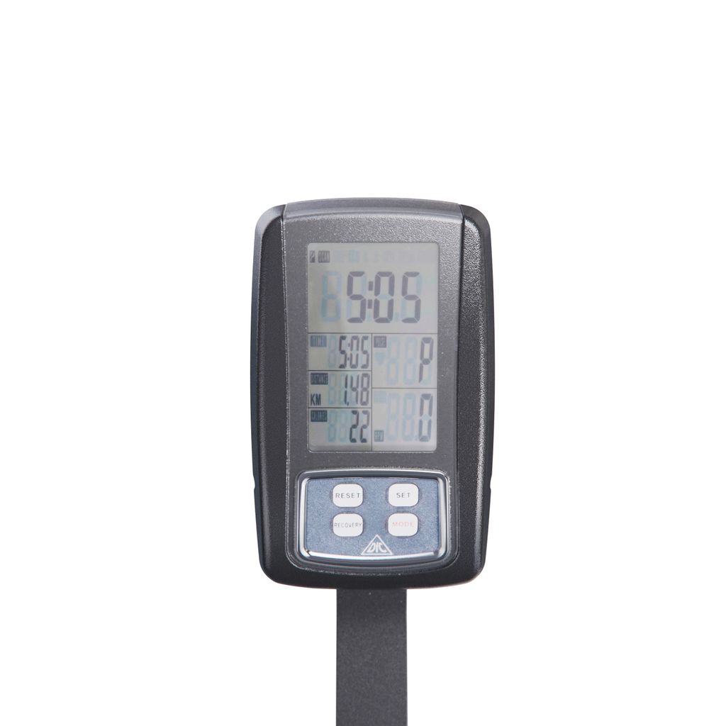 Монохромный дисплей отображает такие параметры как время, скорость, дистанция, калории, количество оборотов в минуту и пульс. Есть целевой режим и режим восстановления.