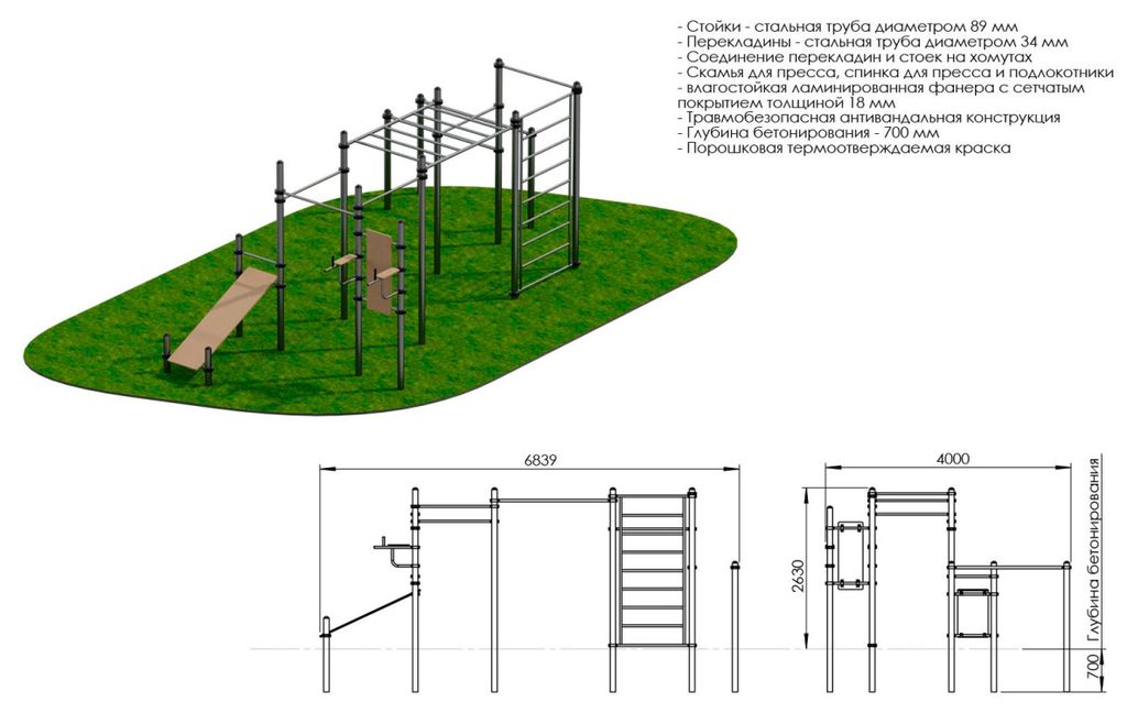 - Перекладины из трубы диаметром 34мм, крепятся к стойкам стальными хомутами;