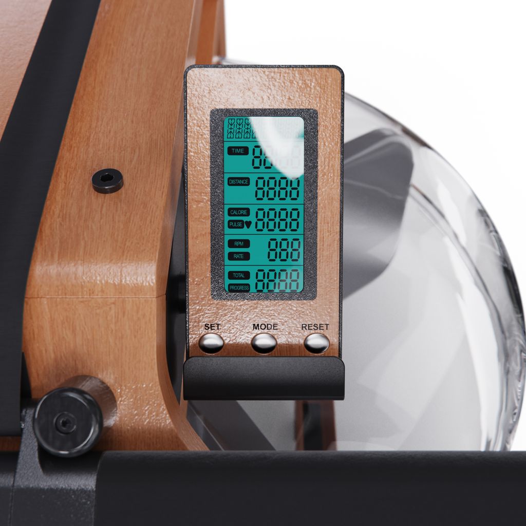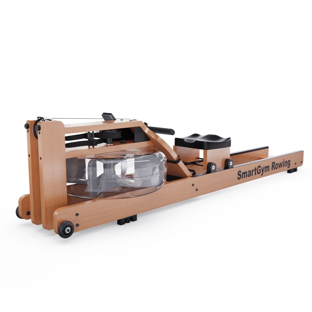 Консоль гребного тренажёра SmartGym имеет 8 уровней регулировки педалей и показывает время, расстояние, калории, пульс и обороты в минуту. Система нагрузки является водной: чем больше вы зальёте в бак воды, тем больше будет нагрузка. Транспортировочные ролики позволяют легко перемещать тренажёр, а его размер в сложенном виде составляет 60 x 56,5 x 210 см.