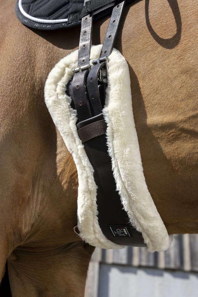 Анатомическая подпруга из полиуретана, похожего на кожу, с подкладкой из синтетической овчины высокой плотности. Роликовые пряжки из нержавеющей стали на двойных эластичных концах с обеих сторон.Имеет центральное кольцо.