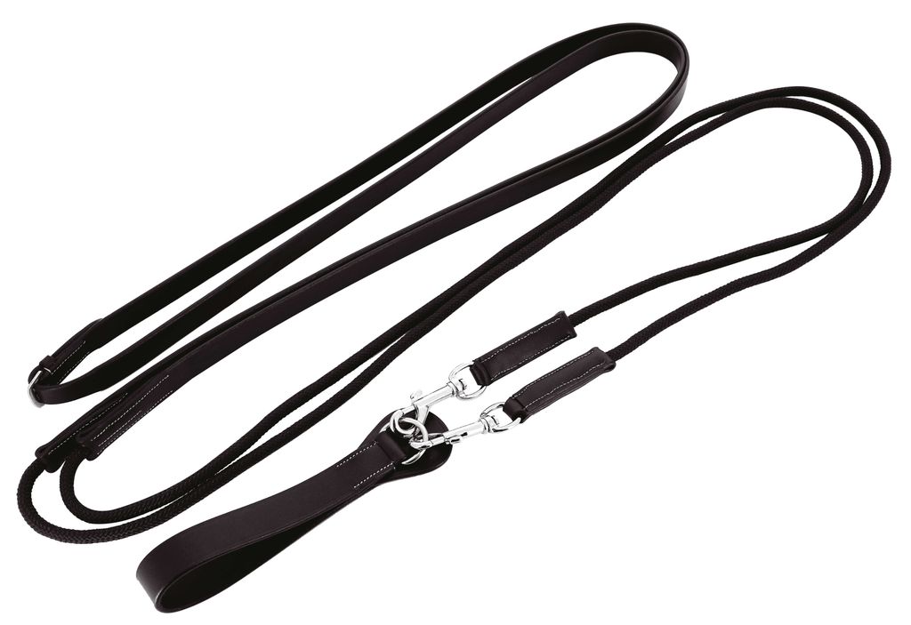 Комбинированный шпрунт, состоящий из нейлонового шнура диаметром 10 мм и из полосы натуральной кожи чёрного цвета. длина шпрунта 5 м. В комплекте: петля с кольцом для одевания на подпругу, застёжки на карабинах, серебристая качественная фурнитура. П...